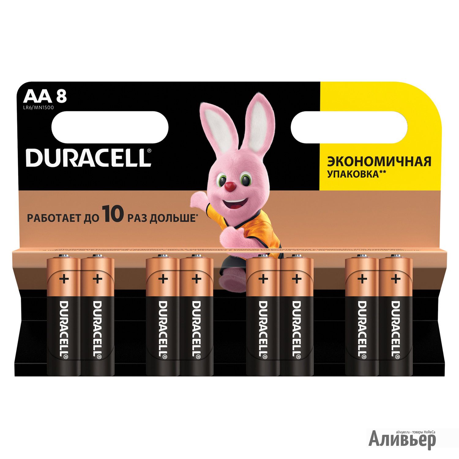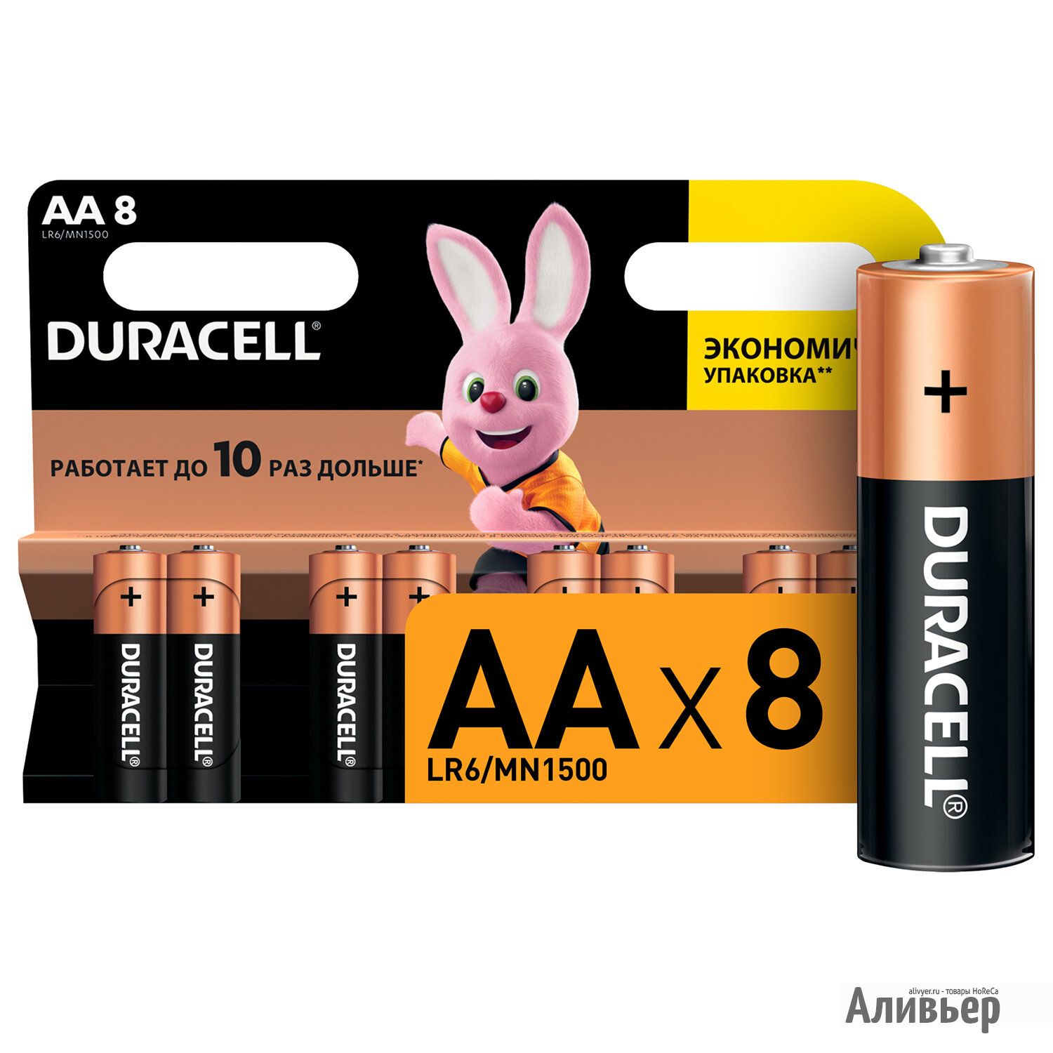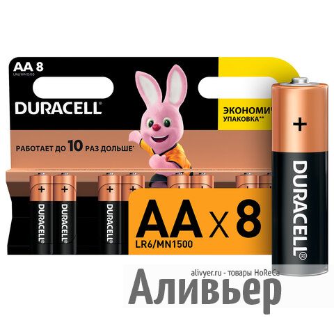Батарейки КОМПЛЕКТ 8 шт., DURACELL Basic, AA (LR06, 15А), алкалиновые, пальчиковые, блистер - особенности: